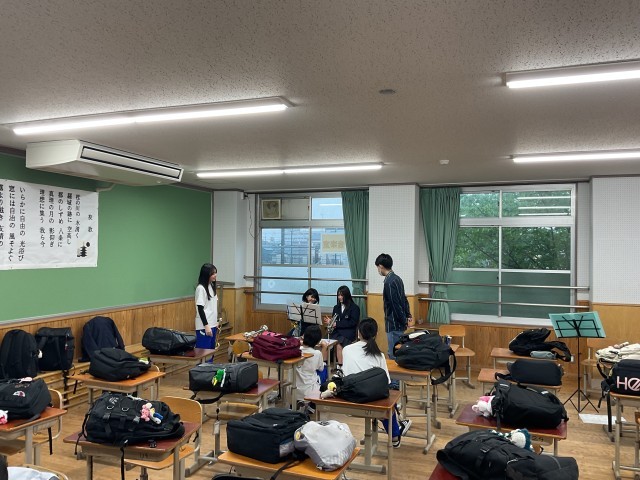 吹奏楽部は、20日月曜日に部集会が行われた後、入部したばかりの1年生の楽器体験が行われています。今日も、1年生がいろんな楽器パートをまわり、先輩から教えてもらいながら楽器の音出しにチャレンジしていました。