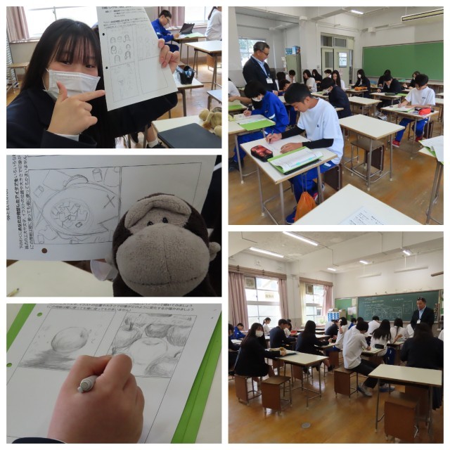 中には、端末を使ってイラストの参考になるものを探したり、先生にアドバイスをもらいながら、授業に取り組んでいました。