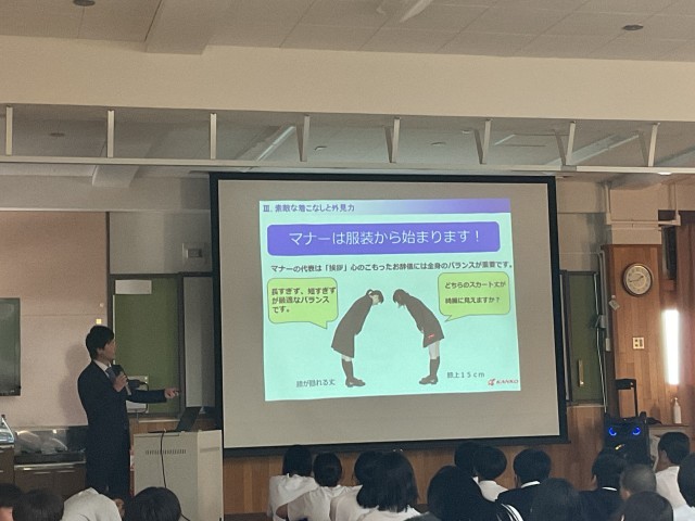 講座では、制服の着こなし、第一印象の大切さ、社会人としてのマナー、礼などの立ち振る舞いの仕方を、協議や実践を通して分かりやすく学ぶことができました。