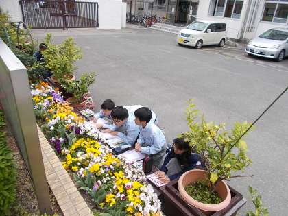 1年生は3,4限に美術の授業で,本講の中庭の草花のスケッチを行いました。みんな熱心に黙々とスケッチに取り組んでいます。