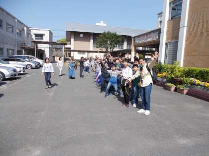 朝,体育館にて出発式を行い,学校を出発しました。全員揃ってとても楽しそうです。