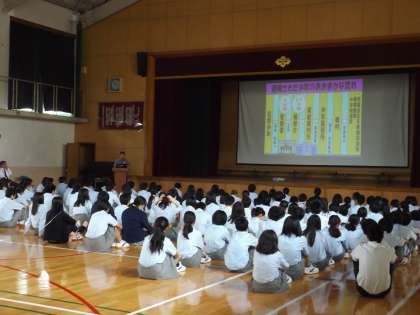 非行防止教室と受付の様子です。非行防止教室では,生徒たちは熱心に講師の話に耳を傾けていました。また,保護者の方にもご参観いただきました。ご家庭でも是非今日の講演についてお話し合いください。