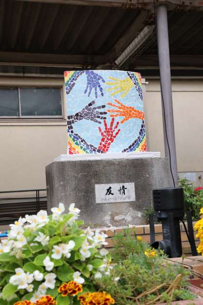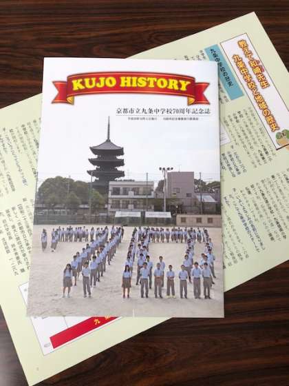 次の写真は,記念式典の様子と,いくつかある記念品のうちの2つ,中庭の池の「友情」を表す新しいモニュメントと記念誌です。モニュメントは,タイルモザイクアートで,美術部が時間をかけて作ってくれました。また,記念誌の中には,記念事業の一環で行った講演会(「九条中の歴史をふり返る」)の内容が分かり易くまとめられています。
