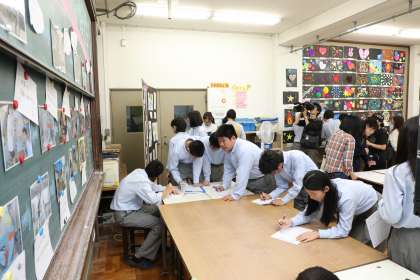 合唱コンクールで午前中のステージ発表は終わり。次は,展示鑑賞とお茶席です。展示鑑賞では,授業の作品や部活の作品,地域の方が作成した作品を,各自チェックシートに記入しながら鑑賞して回りました。
