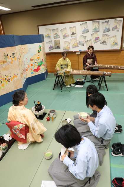 毎年PTAでお世話になっているお茶席は,生徒がとても楽しみにしている催しです。PTAの方に手ほどきを受け,自分でお茶を点(た)てます。お菓子もついてきます。中には,協力いただいている先生にお茶を点ててもらう生徒もいます。お琴の生演奏の中,お点前をいただく。文化の香りのする,とても貴重な体験の場となっています。
