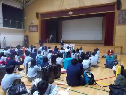 結団式では,校長先生のあいさつ,修学旅行実行委員長のあいさつに続き,3日間お世話になる添乗員さん,写真屋さんの紹介がありました。