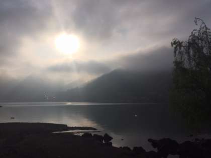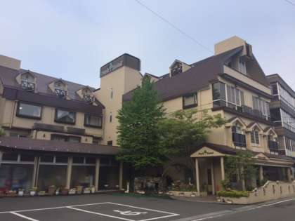 2日目の朝を迎えました。朝の河口湖とホテルです。まだ、富士山は顔を出してくれていませんが、写真を撮る頃には出てくれるのでしょうか。