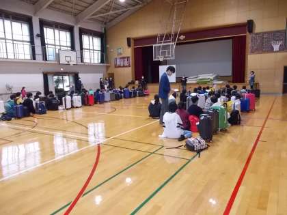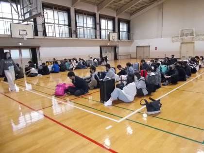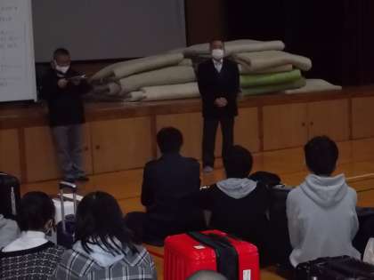 7時45分,修学旅行参加予定者全員集合完了しました。校長先生・修学旅行委員長からの週発に向けてのあいさつのあと,3日間お世話になる添乗員さん写真屋さんの紹介がありました。