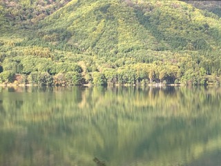 青木湖(上)や木崎湖といったきれいな風景が広がっていますが,バス内はビンゴ大会で盛り上がっています。