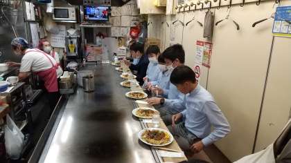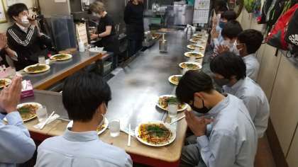 いろいろな店に分かれて、みんなでお好み焼き。結構シュールな風景ですね。