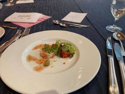 本日のオードブルは「サーモンとポテトのガトー仕立てフレンチキャビア添え」でございます。ガトー仕立てとはケーキに見立てたフランス料理で、 セルクルという丸い型に本日はサーモンとポテトを重ねて型を抜いて作ってございます。とか説明があるのかどうか分かりませんが、味わってお召し上がりください。