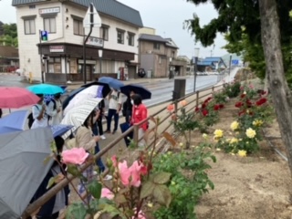 お空は雨模様。傘を差しながらのガイドツアーです。