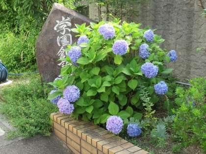 [写真は本校の薔薇(ばら)と紫陽花(あじさい)です。]