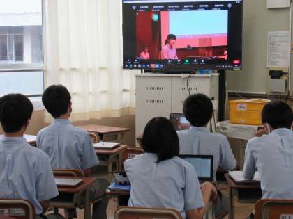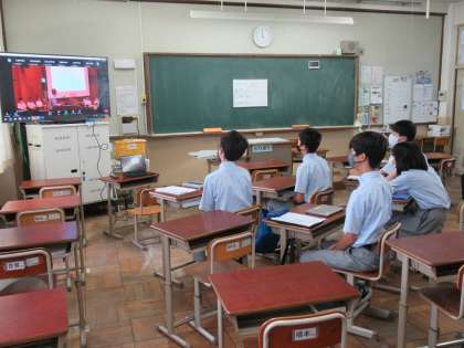 本校の生徒会本部役員のみなさんは、今回は九条中学校にて会議の様子を視聴する形で参加してくれました。それでも、他校の発表者の様子や取組の紹介に刺激を受けながら、九条中学校にも取り入れられないか、前向きに考えてくれていました。