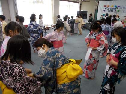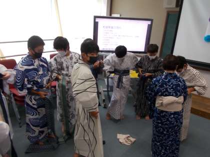 今日は1年生で和装教室がありました。家庭科の時間に講師の方に来ていただいて浴衣の着付けを習いました。みんな楽しそうにあでやかな浴衣やシックな浴衣を着こなしていました。