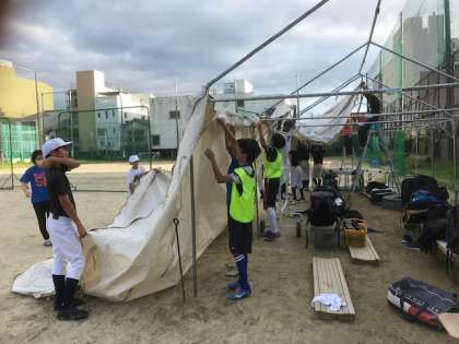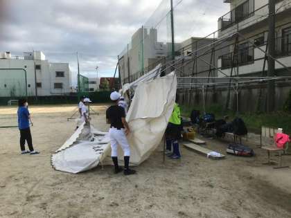 グランドのテントを一旦屋根を外していましたが、サッカー部と野球部の協力で無事設置が完了しました。ありがとうございました。