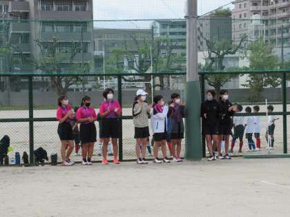 チームの先陣を切って登場した1年生ペアは、初めての大会とは思えないほどの健闘をみせます。デュースの連続となった展開も、お互いに声を掛け合い、ゲームを楽しむかのように思い切ったプレーを披露してくれます。チームのみんなも拍手と笑顔の応援で2人を後押しします。