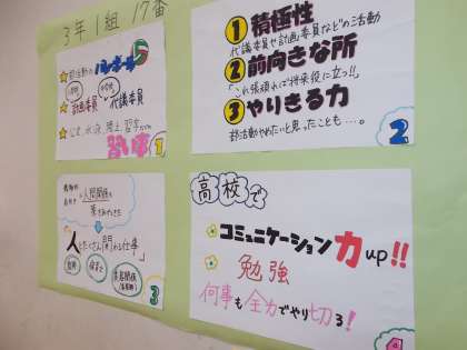 今日はポスターセッション。3年生による「未来の自分を語る」です。今日まで取り組んできた内容を、2年生に向かって発表します。3年生それぞれが自分の未来の姿を考え、その実現のためのプロセスと共に伝えていきます。3年生はこれからの進路決定の向こうにある未来に向かって、2年生は1年後の自分の姿を想像し、意義あるポスターセッションになったようです。ガンバレ九条中生未来に向かって!