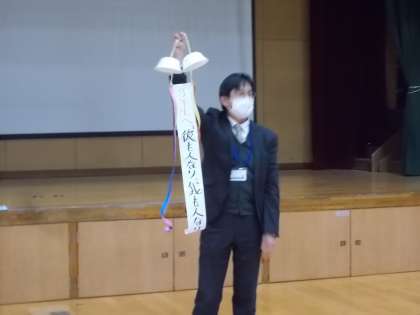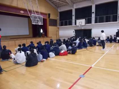 明日はいよいよ私学入試です。3年生は入試に向けての最終チェックのための学年集会がありました。校長先生からは、恒例のくす玉から、中国の故事を採って「彼も人なり、我も人なり」という言葉が贈られました。受験上の注意を確認した後、受験校ごとに分かれて、明日の細かなチェックを行いました。さぁ、自信を持ってがんばれ九条中生!