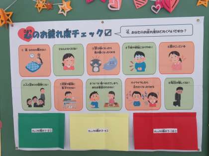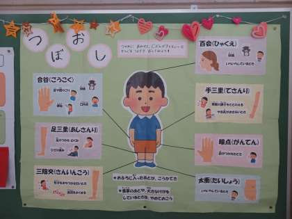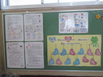 保健室前の掲示板には、健康に関するいろいろな掲示物があります。ただ一般的なポスターなどではなく、「 見方をかえるカード 」「心のお疲れ度チェック 」というように、手作りで、見ているだけでもなんだか心がなごむ内容や作りとなっています。「 つぼおし 」なんか思わずその場で押してしまいます。皆さん、いかがですか…