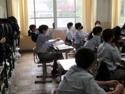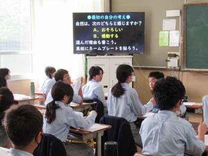 1年2組では、自然に対する「畏敬の念(いけいのねん)*尊敬する気持ち」をテーマに授業が行われました。