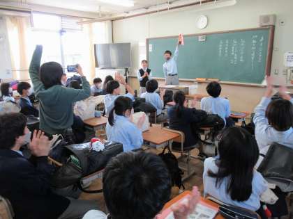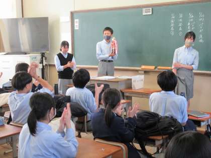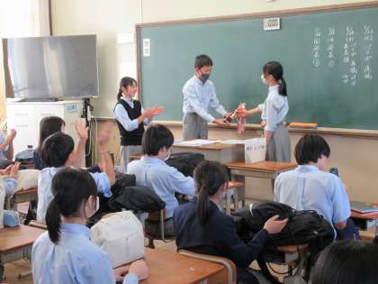 生徒会本部副会長のAさんからトロフィーを受け取り、ガッツポーズと拍手の2年1組の皆さんです。