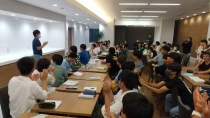 お楽しみレクリエーションの時間がやってきました。イェーイ!係の楽しい投げ掛けに、皆さんもノリノリで応え、一気に盛り上がります。