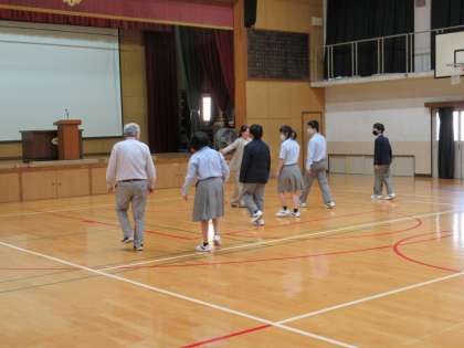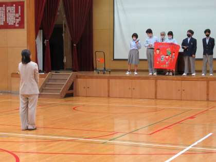 1限自立では、体育館で、来週の生徒総会に備えての発表練習をおこないました。また、2限道徳では、世界地図や日本地図を使い、いろいろな地域のことを自分たちで伝えあっていましたね。