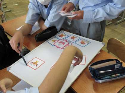 それぞれのキャラクターカードを自分たちなりに並べながら、グループでストーリーを考えていきます。ユニークな課題に、皆さんやる気満々です。