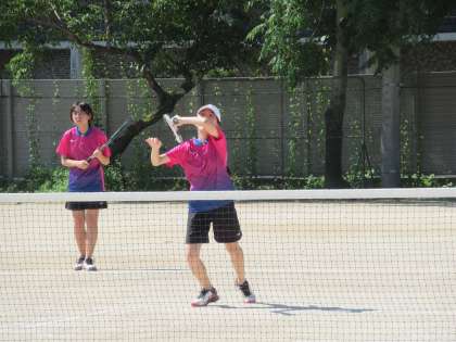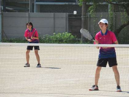それでも、九条0−2から取り返し、九条1−3に、ここから粘りをみせましたが、残念ながらゲームカウント九条1−4で敗退となりました。でも、コートいっぱいを使い、2人の連携も生かし、よく攻めたと思います。