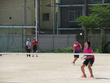 どんな時も、自分たちのペースを崩さず、のびのびプレーで向かっていくN・Oペア。しかし、強烈な相手のボールに苦しみ、なかなかポイントにつながりません。それでも、力を尽くして最後までくらいついていきました。残念ながら敗退となりましたが、よく挑んでくれたと思います。