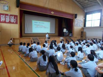 生徒会本部のみんなが、夏季リーダー研修の報告、今学期の行事に向けてシンボルマールや横断幕の紹介、具体的な取り組みについてプロジェクターを使用してていねいに説明してくれました。