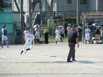 先攻の九条中、1回表の攻撃です。ワンアウトから2番Sさんの痛烈な当たりが左中間へ。1塁、2塁、3塁と回り、相手の連係ミスも逃さず一気にホームへ!幸先よくランニングホームランで先制です。