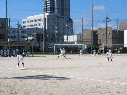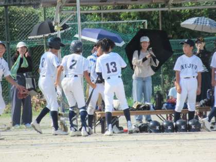 その裏、相手校も、先頭打者がフォアボールを選び、すかさず盗塁を決め2塁へランナーを進めます。ここで九条中は守りの方でも見せます。セカンドのスライディングキャッチ、ピッチャーの速球、そして3塁へ走者を進められますが、ファーストフライから飛び出した走者を見て3塁へ送球、見事ダブルプレーを成立させました。