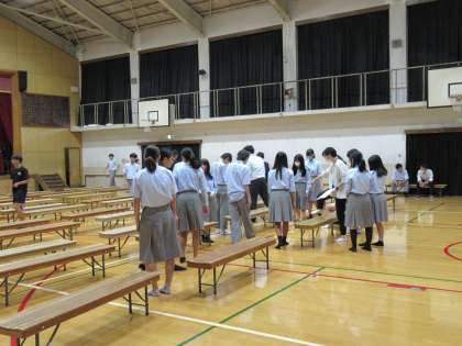 写真は、前日準備の体育館での様子です。本番を自分たちで作り上げるために気持ちがこもった作業の様子が見られました。