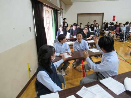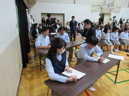 さあ、いよいよ合唱コンクールが始まります。本番を前に、音楽科のH先生から、審査基準の説明があり、続いて審査員の紹介がありました。