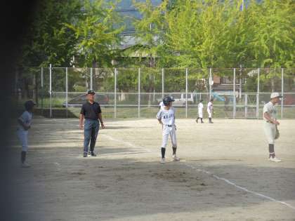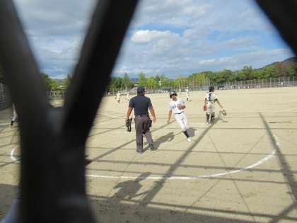 そして最終回、九条中、怒涛の攻撃です。先頭のHさんがいきなりセンターを越える2塁打で出塁すると、内野ゴロの間に3塁へ。続くサードゴロエラーでまず1点。その後、センター前ヒットで更に1点返します。フォアボールで2塁、1塁から相手の隙をついて進塁です。3塁、2塁一打サヨナラの大チャンスを作りました。最後、積極的に食らいつくバッティングも、相手の好守にはばまれ試合終了。