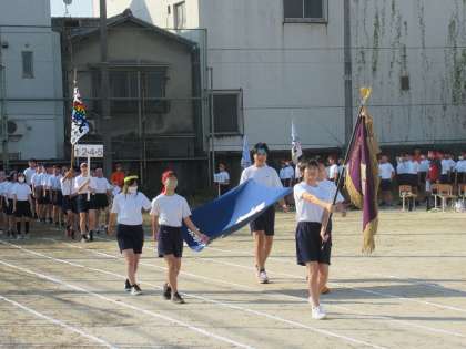 先頭は学校旗をもつ体育委員長Sさん、続いて生徒会旗を本部役員のKさん、Hさん、Sさん、Aさんがもって先導します。