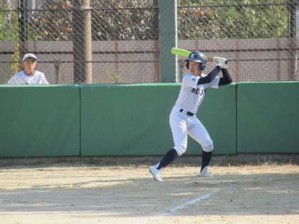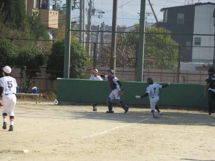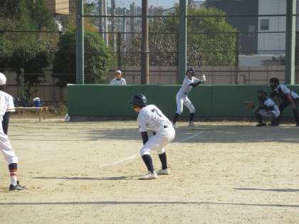 1回表の相手の攻撃を抑え、初回、九条中の攻撃です。Yさんがレフト線ギリギリにエンタイトルツーベースを放ち、更に3塁に進みます。ここで見事なスクイズが決まり先取点は九条中です。