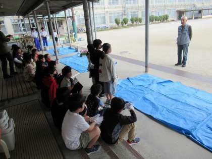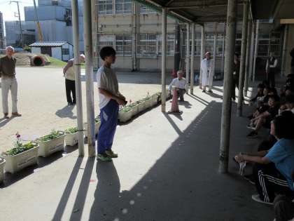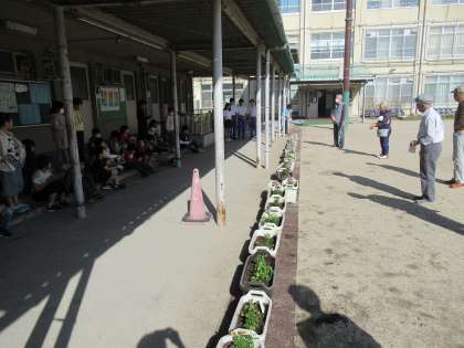今回は、3年生の児童の皆さんが地域の皆さんと行っていただきました。おや、九条中生も!そうです、チャレンジ体験で小学校にお世話になっている2年生の皆さんも一緒にです。