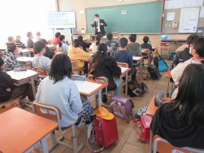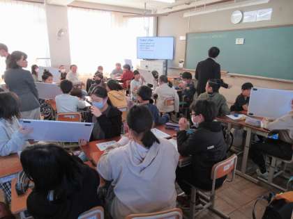 英語の授業では、「自己紹介」をテーマに、グループになって、英語で伝えたり理解したりしていましたね。おっ、ホワイトボードも使って、しっかり伝えています。