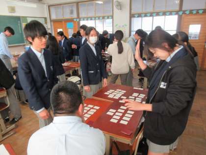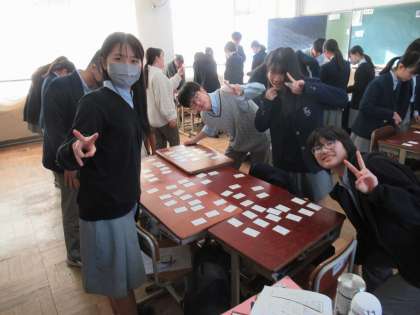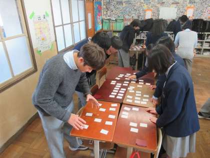 今朝は1時間目から、元気な3年生の声が聞こえてきました。覗かせてもらうと...「百人一首」ですね。なるほど! すっかり漫画や映画「ちはやふる」で若い世代にも身近なものになった「百人一首」ですが、古典の勉強にはよい教材です。
