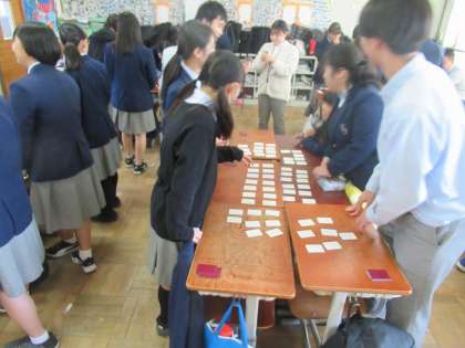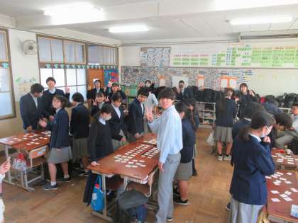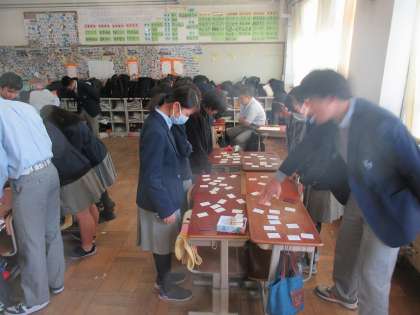 みなさん「競技かるた」風に競い合って、机の上に並べられた取り札(下の句)に注目します。