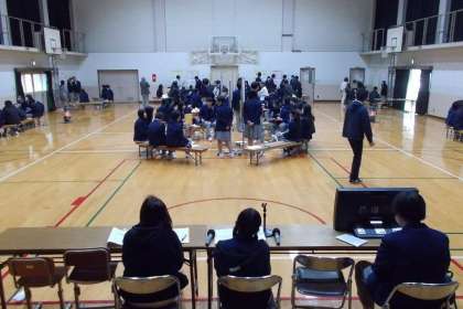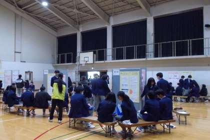 2年生は本日の3、4限目に1年生を招いてポスターセッションを行いました。11月のチャレンジ体験の総括ということで、体験を通じて感じた事や失敗談、また将来に向けて勉強になったことなどを発表してくれました。1年生からの質問に少し困りながらも先輩らしく受け答えする様子は頼もしく感じました。次回は1年生が校区の小学5年生を招いて行う予定です。2年生のみなさんはお疲れ様でした。1年生は次回の準備をしっかり頑張って下さい。