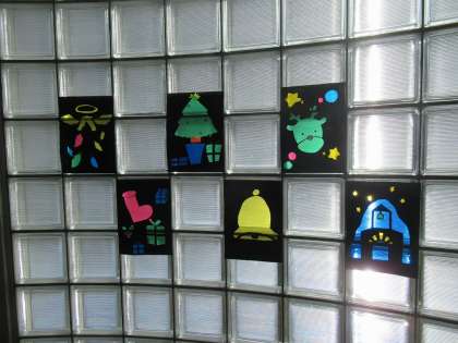 北校舎のガラスブロックの壁に、素敵なステンドグラスが登場です。これは、美術部の皆さんが制作してくれたものです。季節的にいい感じを演出してくれていますねぇ。とっても素敵です!