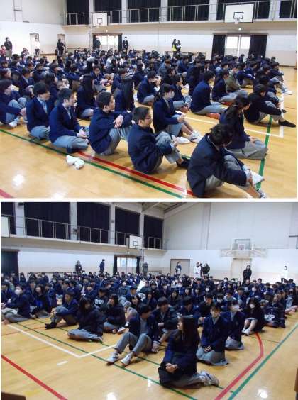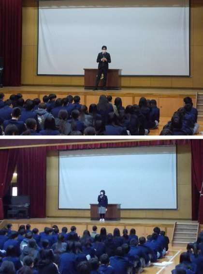 校長先生のお話は、冬休み中に起きた甚大な震災や事故についての内容から、そういう状況の中で今自分にできる事、やらねばならない事を前向きに考えて頑張りましょう。と、そして、生徒会副会長の1年1組KRさんからは今学期の取組みにの成功に向けてみんなで力を合わせて頑張りましょう..と力強いメッセージがありました。