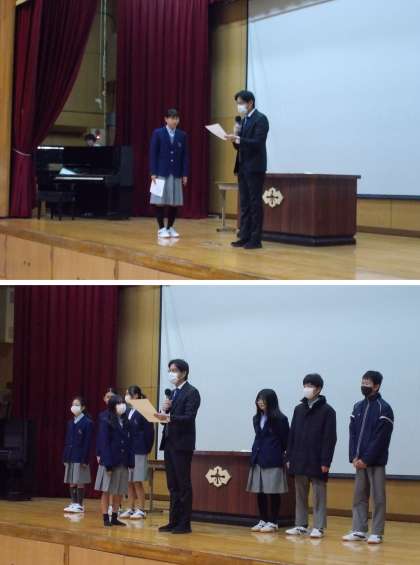 1/5(金) 1限目の始業式..先日の終業式と同じく、3年1組KYさんのピアノ伴奏による校歌斉唱で3学期の九条中が元気にスタートしました。続く伝達表彰では水泳競技、吹奏楽部の活躍に全校生徒から温かい拍手が送られました。