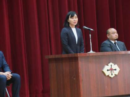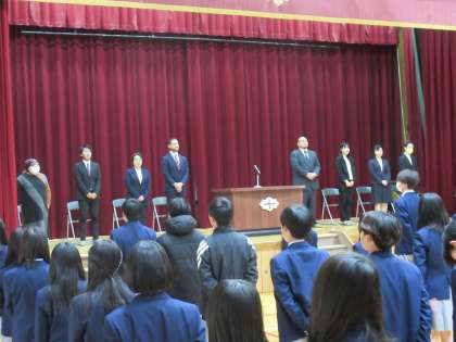 まずは、校歌斉唱です。それぞれの思いを込めてみんなで歌います。そして、壇上の教職員の皆様からのメッセージが伝えられました。