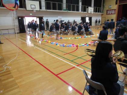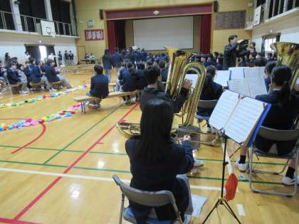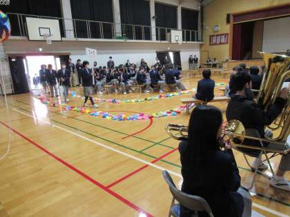 本日3限に、「新入生を迎える会」が盛大に行われました。吹奏楽部の演奏と2年生、3年生の大拍手の中、1年生の皆さんの入場です。