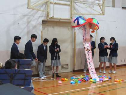 「ご入学おめでとうございます!」1年生の皆さんにはくす玉と記念品が贈られました。
